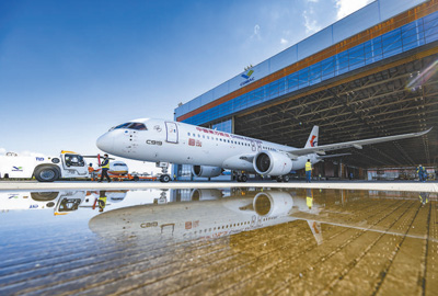 图为一架C919飞机出机库,进行交付前的最后检查。