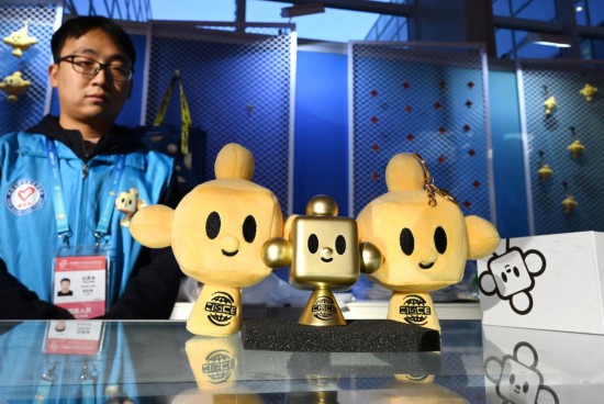 11月29日,在链博会文创小店服务的志愿者向记者展示 “链氪”玩具手办。